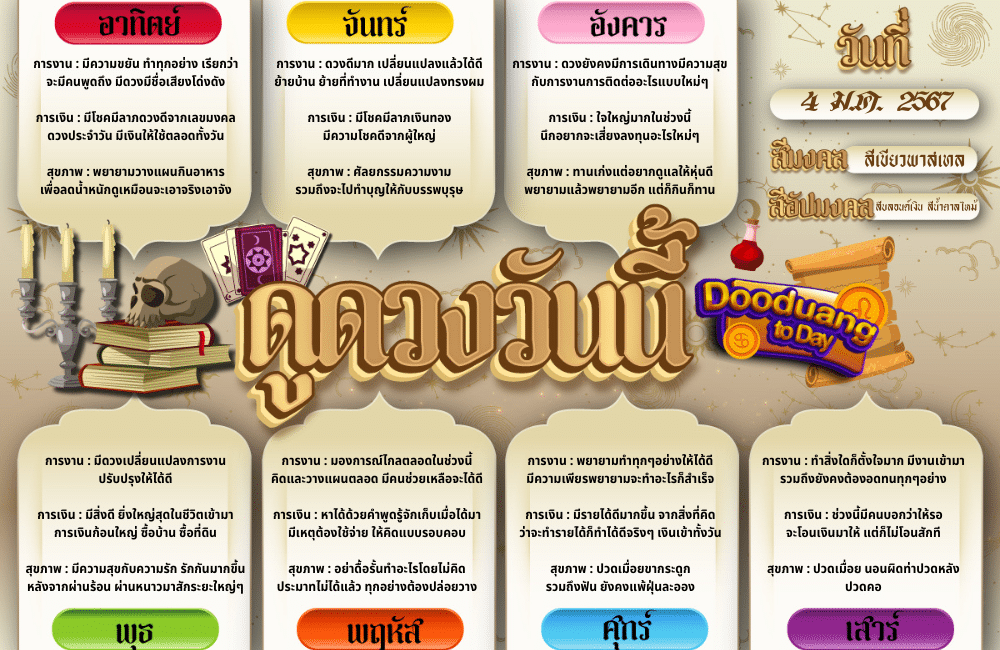 ดูดวงรายวัน ดูรายสัปดาห์แม่นๆ ดูดวงตามวันเกิด ดูดวงตามราศีเกิด ดูดวงไพ่ยิปซี ดูดวงเบอร์โทรศัพท์ ทายนิสัยตามกรุ๊ปเลือด ดูดวงความรัก ดูดวงการงาน ดูดวงการเงิน ดูดวงสุขภาพ ดูดวงไพ่ยิปซีรายวัน ดูดวงโชคลาภ ดูดวงกราฟชีวิต ดู ฤกษ์ดีฤกษ์มงคล ดูดวงไทยรัฐ ดูดวงออนไลน์ ทำนายดวงชะตาตามวันเกิด ดูดวงต่อที่นี่ >> เครื่องรางนำโชค